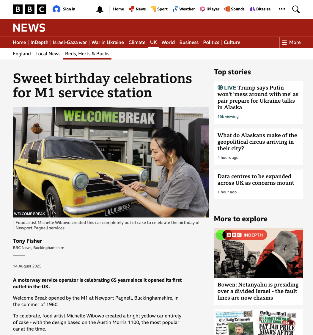This August marks 65 years since Great Britain’s first motorway service area opened its doors, and Welcome Break is celebrating in possibly the most delicious way imaginable - with a car made entirely of chocolate birthday cake covered with bright yellow fondant, detailed with shiny chrome trimming painted using edible food colouring.