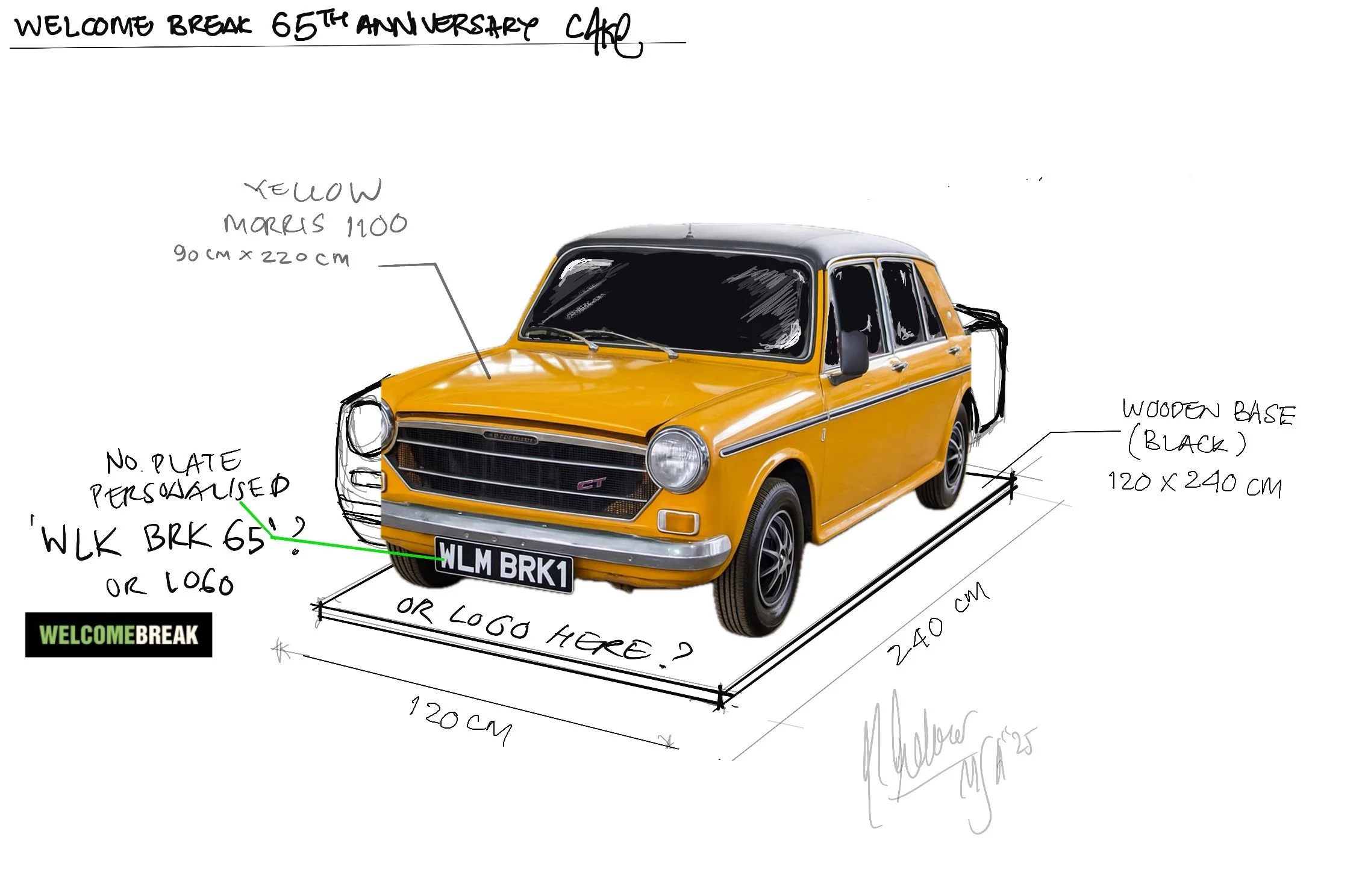 Cake design concept for Welcome Break 65th Anniversary Cake based on the Yellow Austin/Morris 1100 a popular car in that era.